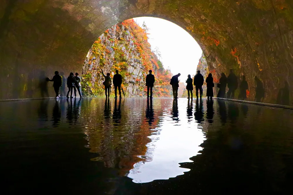 日本三大峡谷のひとつ。トンネル内のガラス窓から眺める紅葉渓谷は迫力満点。